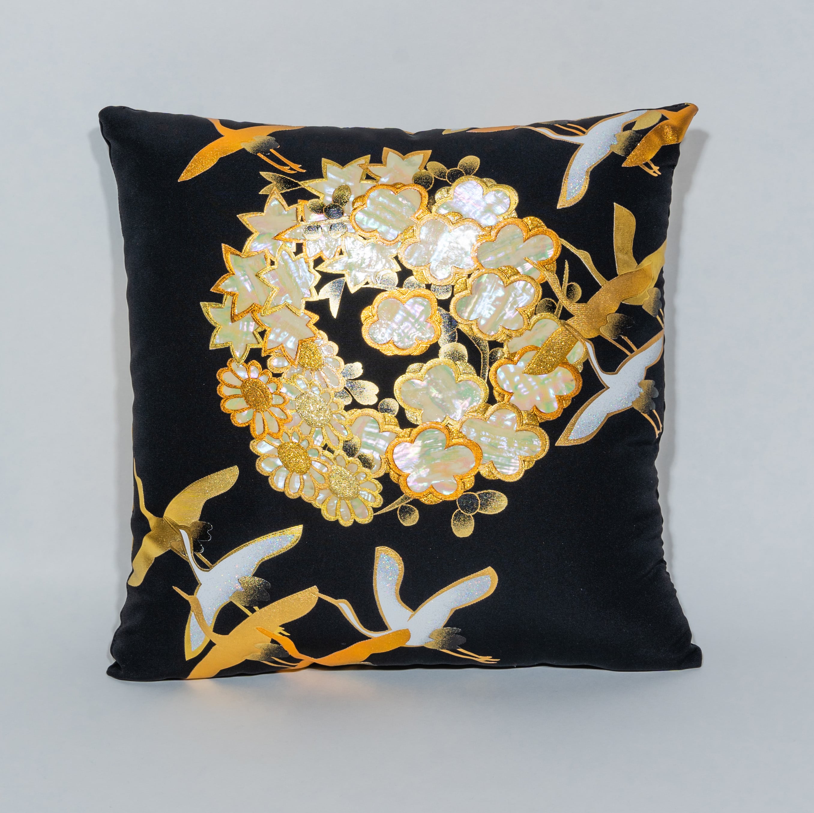 印象的な金彩クッションが登場しました!黒地に華やかな丸花と光琳鶴の模様を施し、高級感漂う螺鈿仕様に仕上げました。存在感のあるデザインで、お部屋のアクセントにぴったりです。