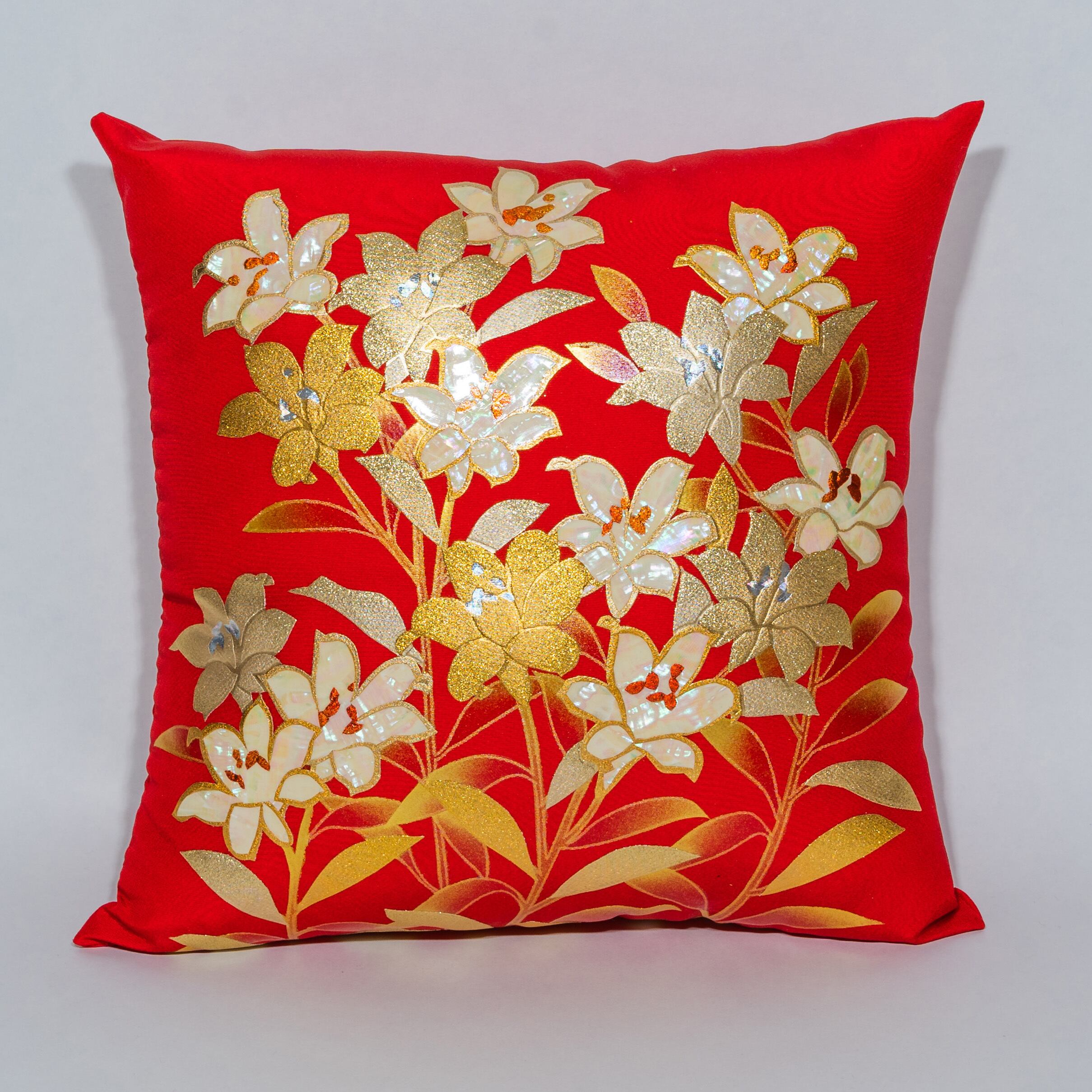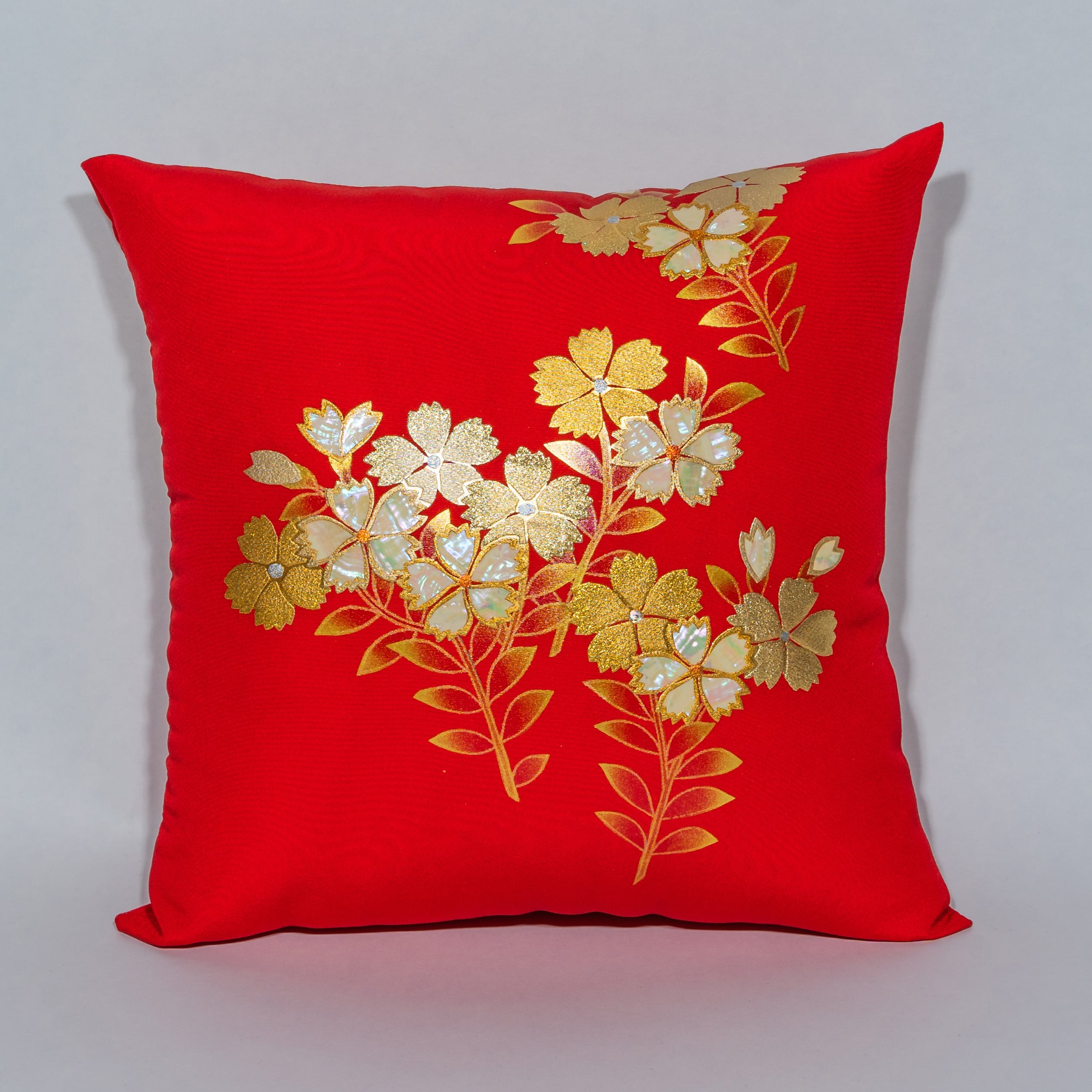 打掛(和装の花嫁衣装)を手掛ける京都の職人が伝統技術を生かし作り上げたクッションです。高級婚礼衣装制作の技術・技法・素材などをそのままにクッションに落とし込みました。