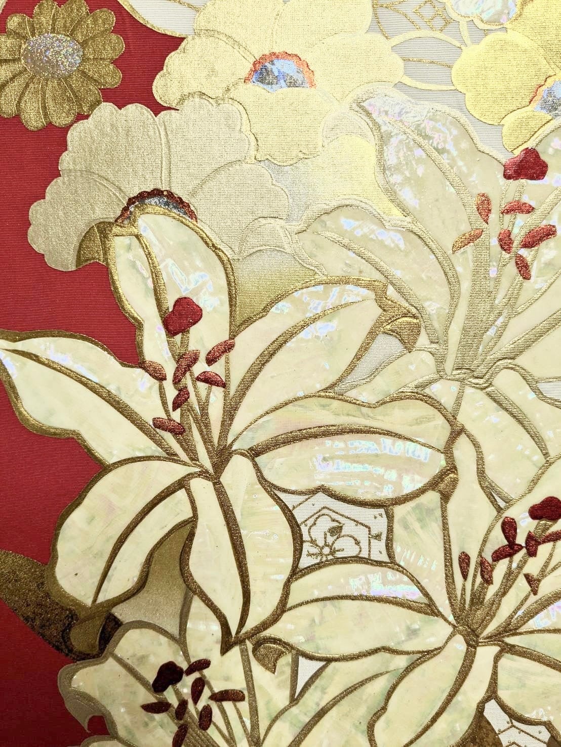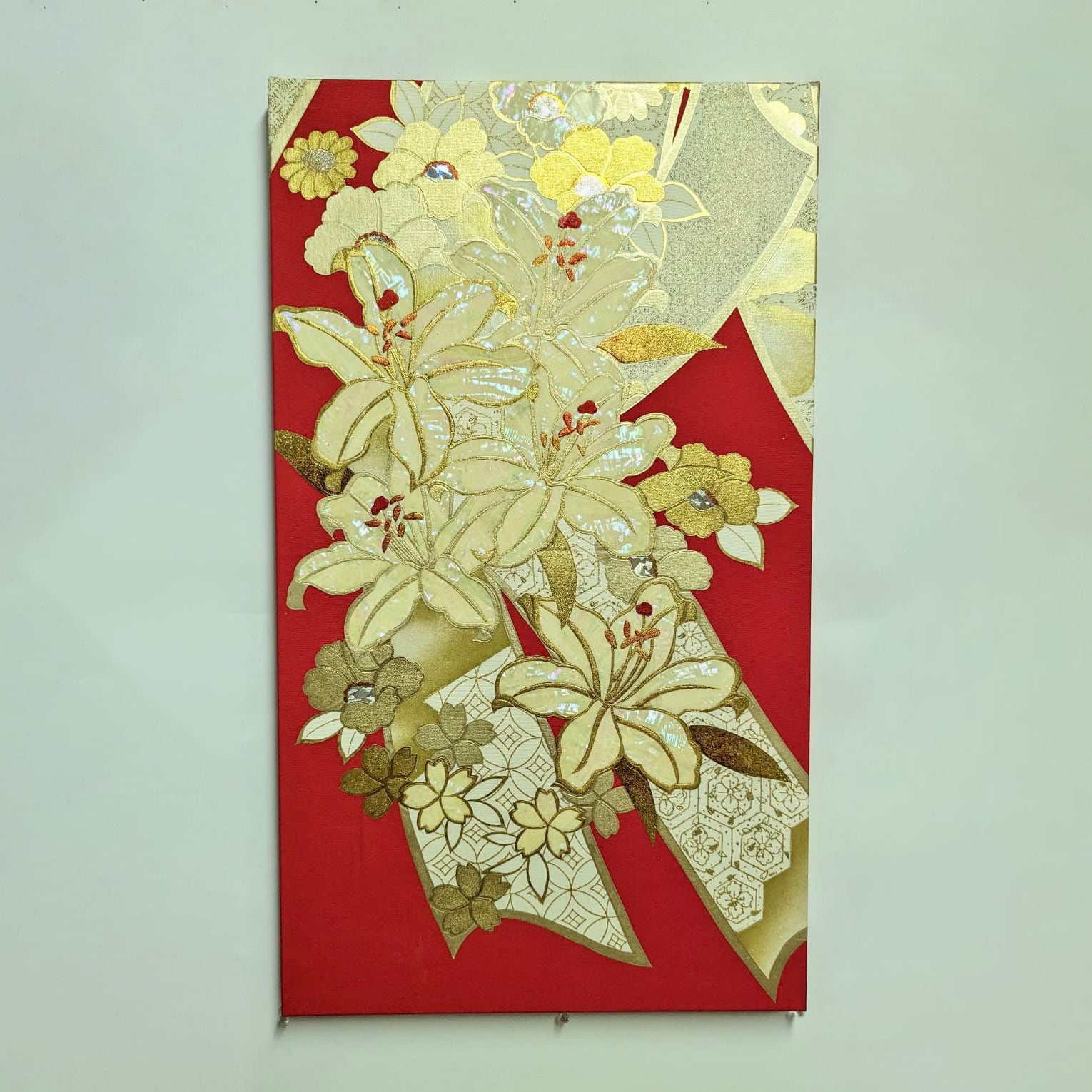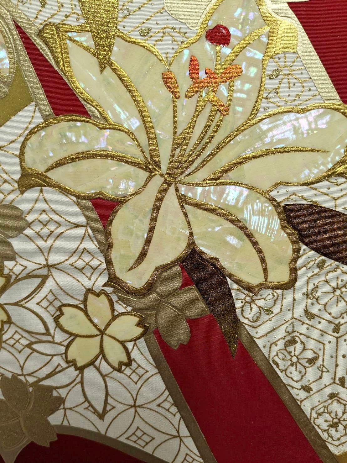 打掛(和装の花嫁衣装)を手掛ける京都の職人が伝統技術を生かして作り上げたパネルです。 高級婚礼衣装制作の技術•技法•素材などをそのままにパネルに落とし込みました。 金彩工芸、螺鈿(らでん)を施した作品です。 サイズ 55㎝×32㎝ 厚み2㎝ 材質 シルク生地、金箔など ※パネルの裏に壁掛け用の穴が空いています。