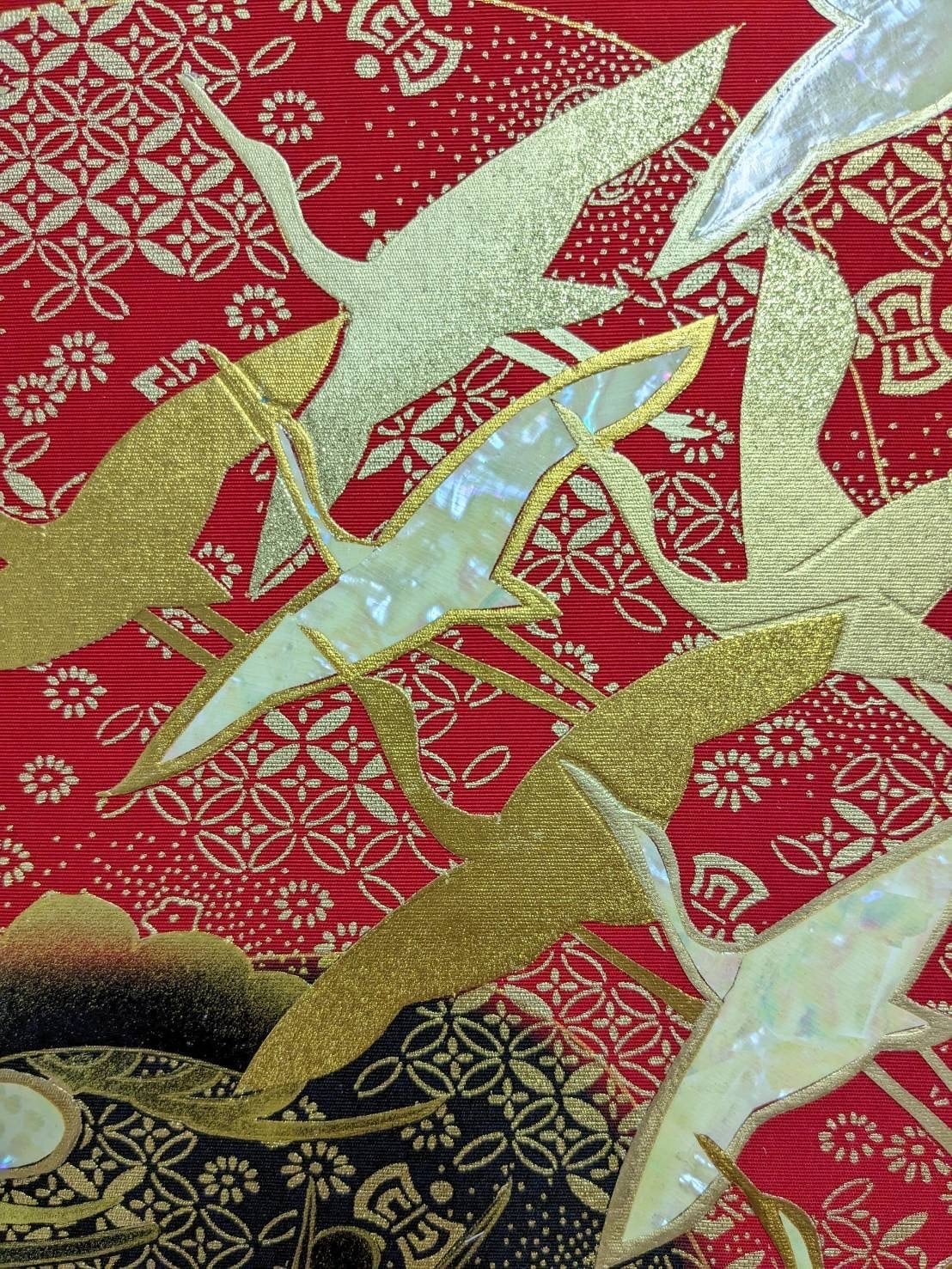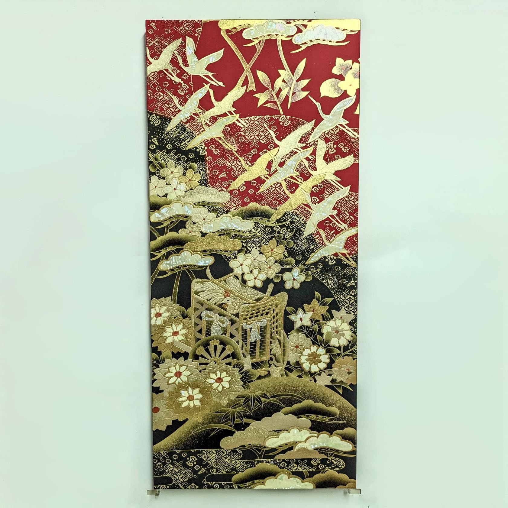 打掛(和装の花嫁衣装)を手掛ける京都の職人が伝統技術を生かして作り上げたパネルです。 高級婚礼衣装制作の技術•技法•素材などをそのままにパネルに落とし込みました。 金彩工芸、螺鈿(らでん)を施した作品です。 サイズ 73㎝×32㎝ 厚み2㎝ 材質 シルク生地、金箔、金粉、鮑貝など ※パネルの裏に壁掛け用の穴が空いています。